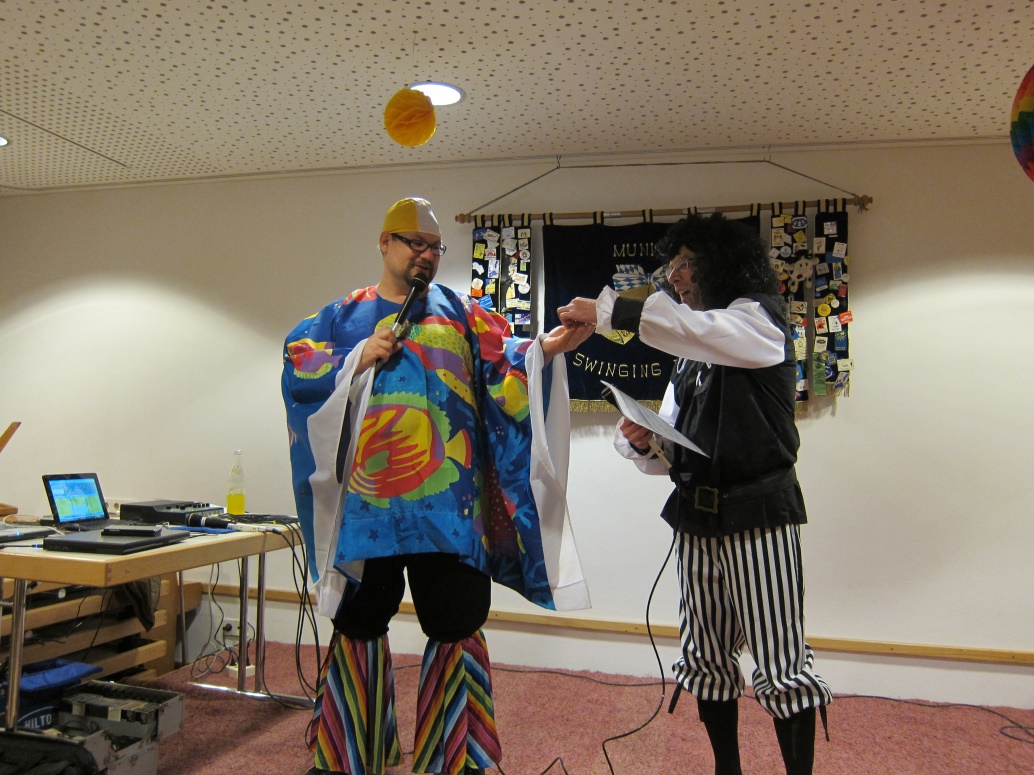 Auf der Bühne das bewährte Trio: Martin, Christof und Markus, der dieses Jahr den Senfkrapfen erwischte und dafür einen Senfdangle vom Presi Peter erhielt.