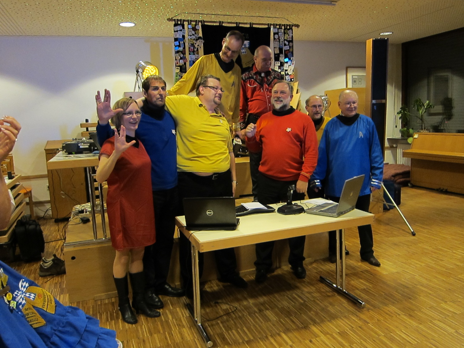 Markus gab uns dann eine kurze Einführung. Martin hatte dieses Jahr sein 15-jähriges Cuerjubiläum bei den Swinging Bells. Eine seiner liebsten Fernseh- und Filmsendungen war und ist wohl Star Trek. Und so hatten sich einige MSB´ler in Figuren der Enterprise verwandelt. Sogar der President der Konföderation war anwesend. Eigenartigerweise hielt er später auch die Announcements.