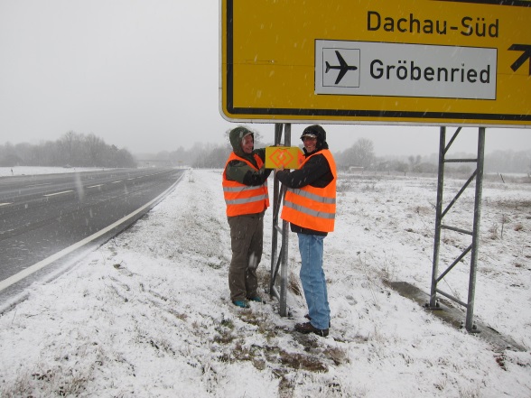 Um 10:00Uhr trafen sich Heinz H., Peter, D. und Brigitte S. bei den ASV-Hallen in Dachau und machten sich auf den Weg die Hinweisschilder an den Einfallstraßen zu befestigen.