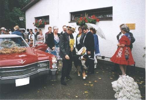 Die Einladung zum 50. Geburtstag von Hermann verbarg noch eine besondere Überraschung. Hermann und Lissy hatten standesamtlich geheiratet und im Ausflugslokal Waldfrieden in Hebertshausen alles für eine große Feier herrichten lassen. Im Convoy, an der Spitze der Cadillac von Ernst mit den frisch Vermählten, ging es in Square Dance Outfit zum Lokal. Hier vollzog dann auch Christof die Zeremonie einer Square Dance Hochzeit mit den Brautleuten. Bis spät in die Nacht vergnügten sich alle auf diesem wundervollen Fest.