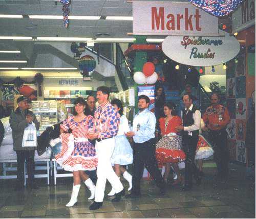 Gleich im März tanzten wir im Rahmen eines Dia-Vortrages über "Amerika" im Feringahaus in Unterföhring, wirkten mit bei einer Kinder Demo auf der Ranch mit Caller Michael Braithwaite und in der Kaufhalle in Laim anläßlich einer Amerikawoche.