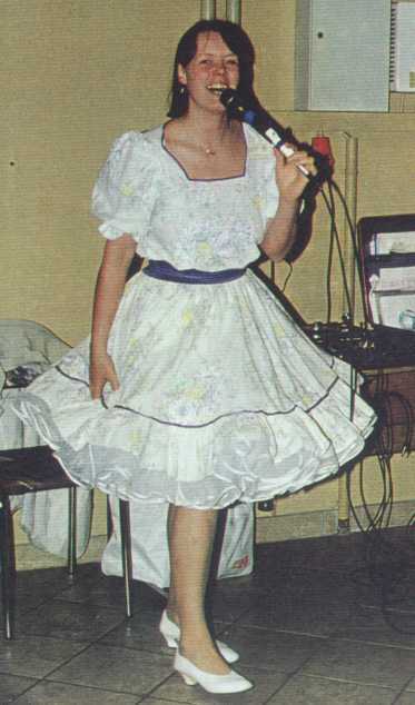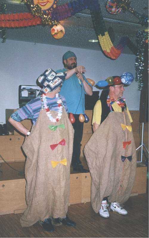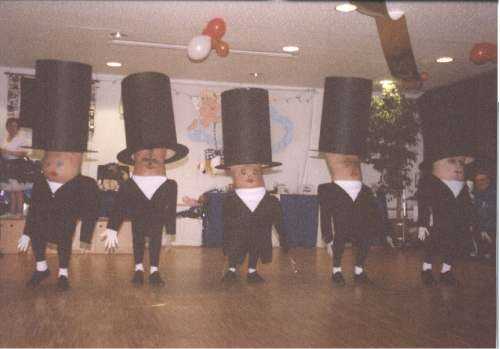 Bleibt noch vom "Swing Out - Swing In" 1999 - 2000 zu berichten. Die Country Stimme des Nordens Edeltraud Mertmann war eingeladen und brachte gleich mit den ersten Warm Up Übungen die Tänzer in Schwung. Mit Christof im Duett hörten wir beschwingte Singing Calls und lernten noch die Figuren Nr. 1999 und Nr. 2000! Als besondere Attraktion trat das MSB-Männerballett auf. Unter der Last riesiger Zylinder und nackigen Bäuchen tanzten sie uns den "Mambo-Number Five - a little bit more". Ein interessanter Abend, abgerundet von Cuerin Heidi Mennes, die unsere Round Dancer verwöhnte. Das Büffet war wie immer Spitze und zur besinnlichen Stunde hatte sich der neue Pfarrer der Gemeinde, zur traditionellen Mitternachts Andacht bereit erklärt.