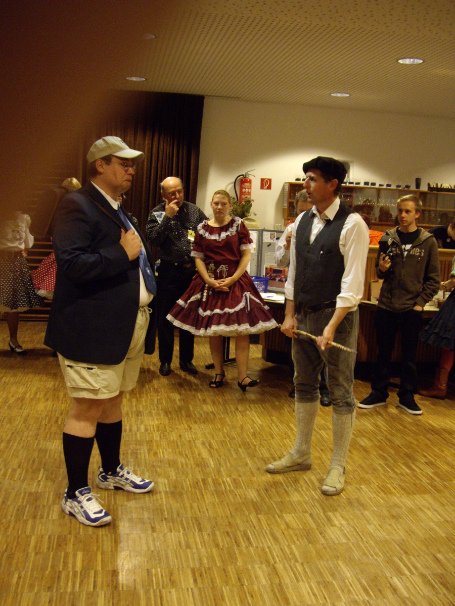 Als Caller hatte sich unser Markus G. zur Verfügung gestellt, der die kompletten 45 Minuten ohne Pause (und leider auch ohne Getränk) auf der Bühne ausharrte und jeweils 2 Squares mit Singing Calls über die Bühne scheuchte. Die Organisatoren Franz Schwaiger und Hans-Dieter Keh teilten die Tänzer in 3 Gruppen ein.